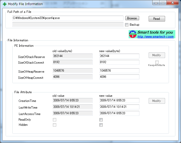 VBで開発したアプリケーションはスタックサイズが1MB固定でコンパイルされているため(変更するコンパイルオプションはありません)、業務データによってスタックサイズ不足問題がよく発生しています。 ファイル属性変更ツールは実行可能ファイルのPEF情報(スタックサイズとヒープサイズ)及びすべてのファイルのタイムスタンプ属性をGUIで簡単に変更できるツールです。 ※変更可能な実行ファイルは32bitのみ |
